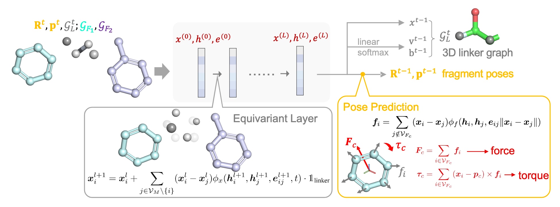 - 构建了一个三维等变扩散模型,在统一框架下实现片段构象与三维连接体结构的协同设计;