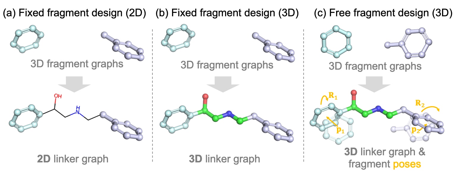 图2 | 不同连接体设计设定的概览。 (a)/(b):以往研究主要集中于在固定片段构象条件下的二维或三维连接体设计。(c):该研究关注片段构象与连接体的协同设计。