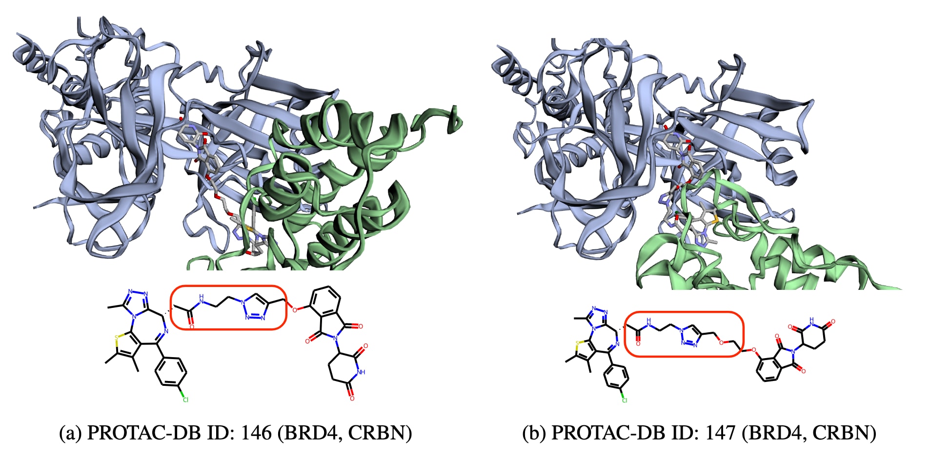 图1 | 展示了在PROTAC设计中片段构象并非固定的示例。 上方的两个子图分别展示了两种PROTAC分子,它们的一个片段与BRD4靶蛋白结合,另一个片段与CRBN E3连接酶结合。两者的连接体在结构上存在差异,其中一个包含“COC”基序。