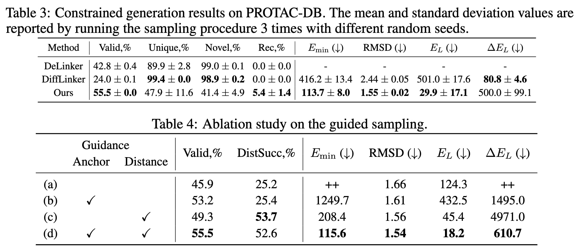 - 通过在ZINC与PROTAC-DB数据集上的综合实验,验证了模型在无约束与有约束条件下的优越性能。