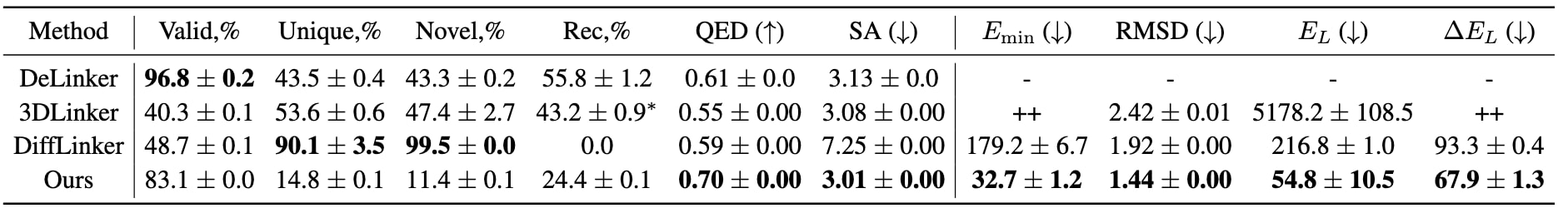 为进行基准测试,将该研究提出的模型与三种现有方法进行比较:DeLinker、3DLinker与DiffLinker。DeLinker是一种基于二维分子图的生成模型,而3DLinker与DiffLinker分别基于变分自编码器(VAE)与扩散模型的三维生成模型。由于目前尚无能够同时完成片段构象与连接体协同设计的生成模型,该研究在比较时通过随机采样片段旋转并向片段中心位置添加噪声,然后将这些噪声化片段输入上述模型以生成连接体。