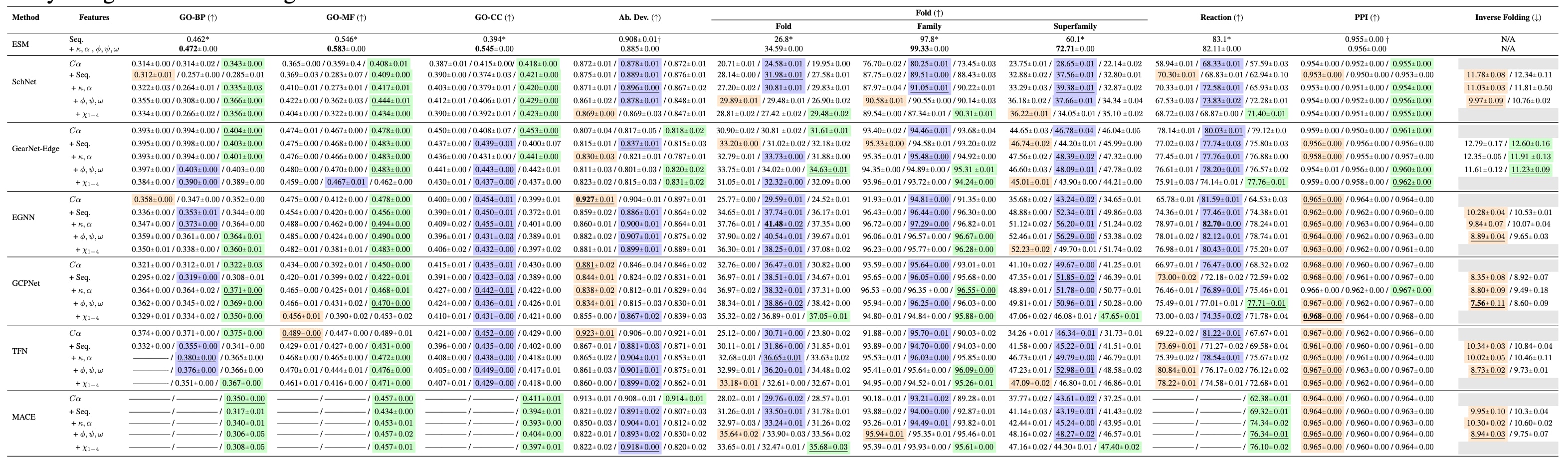 概述 为了展示该基准的实用性,研究系统考察了蛋白质结构表示方式、模型架构选择以及预训练或辅助任务的不同组合,并分析它们在多种任务上的预测性能表现。所选任务聚焦于具有实际应用价值的结构注释问题,以便从整体和局部两个层面评估模型的表示能力。为此,研究选取了一系列先进的蛋白质结构编码器以及通用的几何图神经网络架构,这些模型在消息传递阶数和张量阶数等设计维度上覆盖了几何GNN的主要设计空间。同时,还评估了多种结构表示形式,这些表示在不同程度上捕获了蛋白质结构的完整细节。
