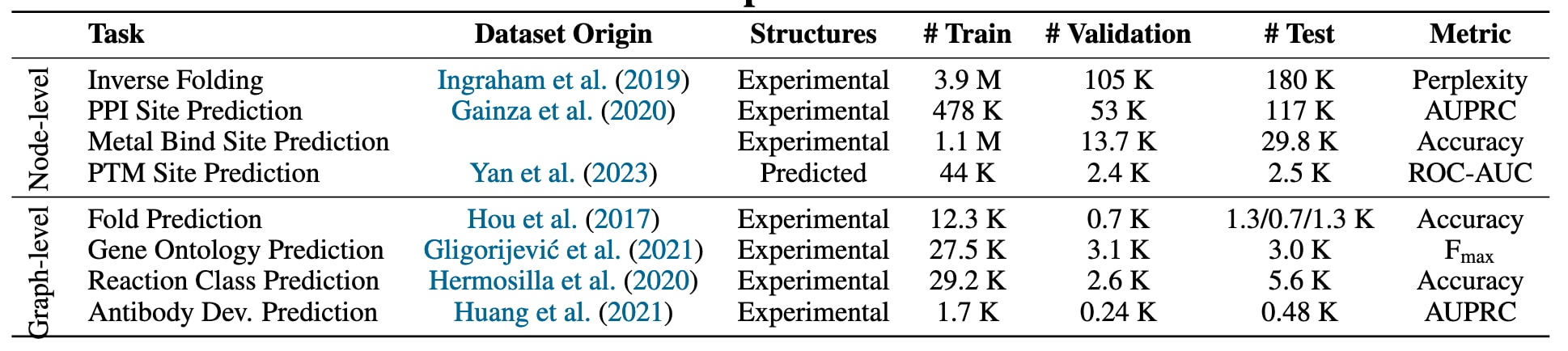该工作从已有文献和基准中整理了多种基于结构和基于序列的数据集,其概要列于表1。这些任务不仅用于评估模型在整体结构层面的表示能力,同时也用于考察模型学习信息性局部表示的能力,以支持残基层面的预测与注释任务。