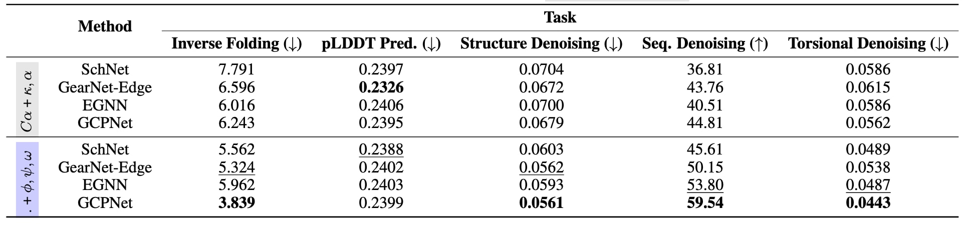 表3|在AlphaFoldDB上进行预训练任务的验证集性能结果。 评测指标包括:逆折叠任务使用困惑度;pLDDT预测、结构去噪和扭转角去噪任务使用均方根误差;序列去噪任务使用准确率。加粗结果表示最优性能,带下划线的结果表示次优性能。主要结论在于,相较于仅使用序列上的虚拟角度特征,在特征化中引入主链结构信息,即加入扭转角φ、ψ和ω,通常能够显著提升预训练阶段的性能表现。