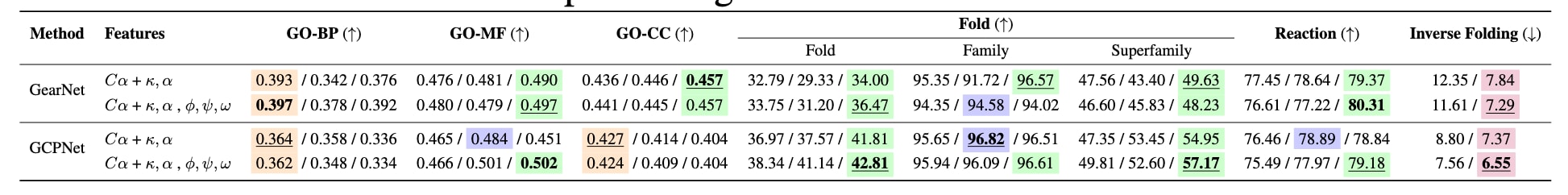 表4|预训练模型的基准评测结果。 每种模型与特征化方案组合的结果按以下顺序给出:不进行预训练 / 序列去噪预训练 / 结构去噪预训练。其中,在CATH数据集上的逆折叠任务采用在AlphaFoldDB上进行逆折叠预训练的模型。主要结论是,等变的GCPNet模型从预训练以及引入最大程度结构细节的特征化方案中获得的收益最为显著。