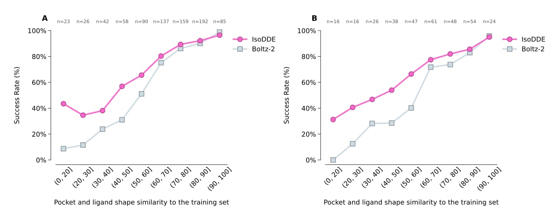 图4|IsoDDE与Boltz-2在Runs N’ Poses基准中、基于Boltz-2训练截止日期之后样本的性能对比。 相似度区间的划分以Boltz-2训练集为参照,即使用2023年6月1日之前发布的PDB结构计算样本相似性。图中展示的是按置信度排序后最高预测结果的成功率,横轴上方的数字表示各相似度区间内的样本数量。A为完整数据集的结果,B为在聚类基础上进一步过滤掉124种高频配体后的结果。IsoDDE与Boltz-2之间性能差异的进一步定量分析汇总于表5中。