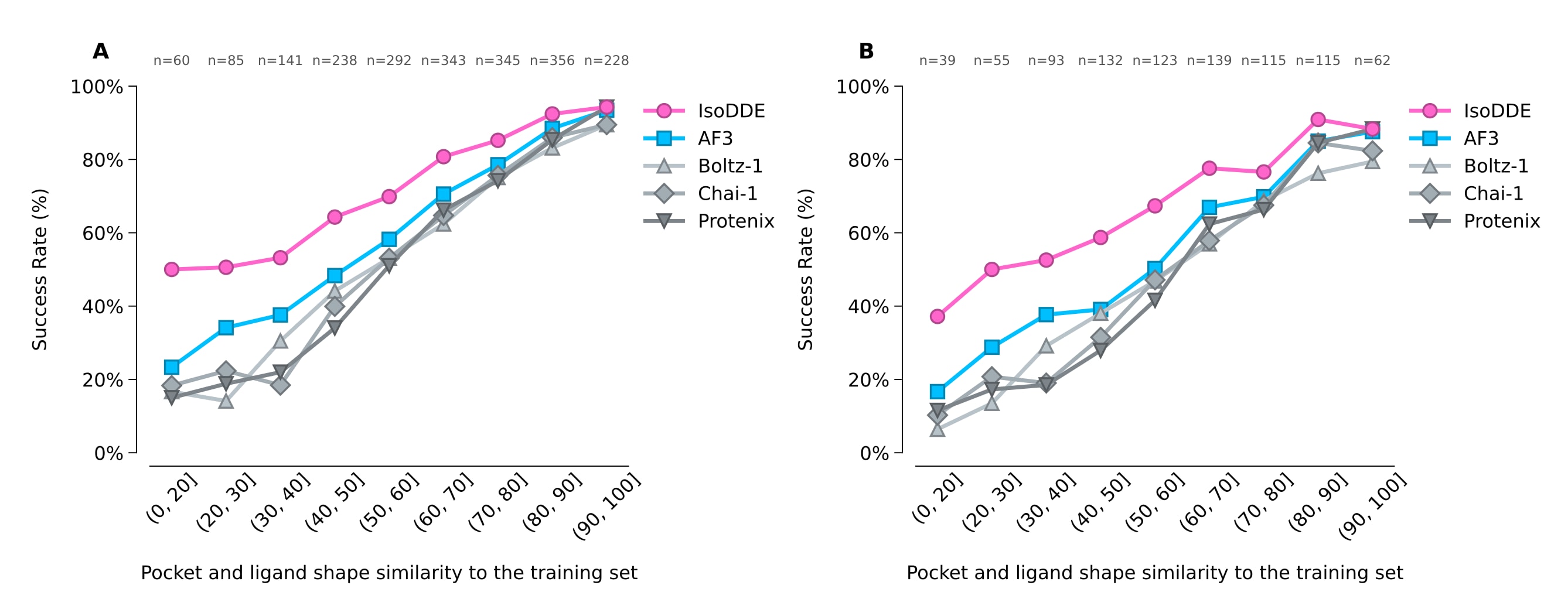 Runs N’ Poses基准被提出用于评估蛋白-小分子共折叠模型在远离训练集样本时的泛化能力。该基准通过两类指标刻画样本与训练数据之间的差异程度,其中结合口袋相似性基于口袋残基的序列一致性进行度量,配体相似性则依据分子形状叠合程度进行评估。整个基准数据集由在AlphaFold 3训练截止日期之后发布的蛋白-小分子复合物结构组成,并按照其与训练集中最近邻样本的相似度划分为不同区间。研究在与AlphaFold 3相同训练截止条件下,对IsoDDE在各相似度区间内的预测准确率进行评估,并将结果与AlphaFold 3及Runs N’ Poses基准中已报道的其他模型进行对比。评估过程中,每个目标从25个采样结果中选取置信度最高的单一预测作为最终结果。图2的结果显示,在与训练集相似度最低、同时也是泛化难度最大的区间内,IsoDDE的性能提升尤为显著,在其余区间中同样表现出稳定且明显的改进。