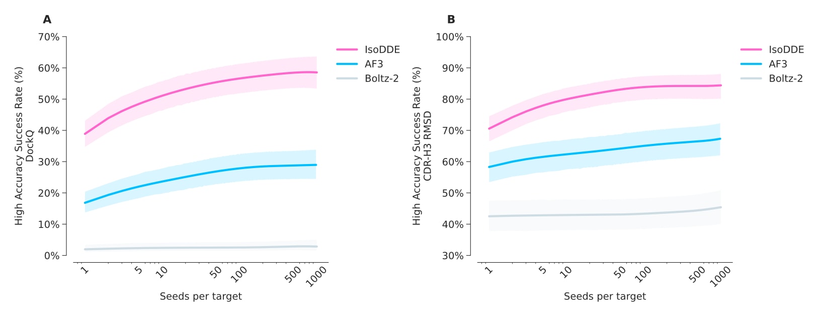 已有研究表明,通过增加推理阶段的计算规模可以提升抗体-抗原结构预测的性能。在此基础上,当使用1000个模型种子并根据置信度进行排序时,IsoDDE在该测试集上的表现进一步提升,在DockQ正确预测和高精度预测中的成功率分别达到82%和59%,同时具有高精度CDR-H3预测的抗体比例提升至84%。随着种子数量的增加,IsoDDE和AlphaFold 3的性能均呈现出持续改善的趋势。尤为引人注目的是,即便仅使用单一种子,IsoDDE在DockQ和CDR-H3预测上的表现仍优于AlphaFold 3和Boltz-2在使用1000个种子时的结果。