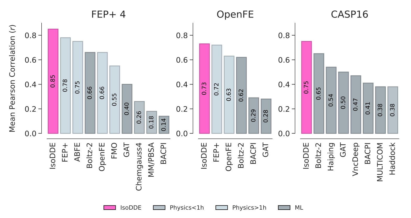为评估IsoDDE在贴近真实药物研发流程的计算场景中的表现,研究对ChEMBL 35中所有新近收录的实验测定数据进行了结合亲和力预测。如图8所示,IsoDDE在不同类型靶标上均保持了较高且稳定的预测性能。进一步与物理模拟方法进行对比的结果如图9所示,在FEP+ 4、OpenFE以及近期CASP16盲测结合亲和力预测任务这三项公开基准中,IsoDDE在整体表现上显著优于所有对比的机器学习方法。更为引人注目的是,即便考虑到物理模拟方法通常基于晶体结构作为起点,IsoDDE在部分评测中仍然能够超越这些公认的物理方法。