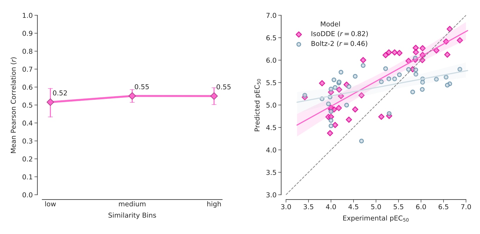 图10|IsoDDE性能分析。 左图展示了在ChEMBL 35数据集中,模型在不同配体相似度区间内的性能稳定性。相似度通过Morgan指纹计算,定义为每个实验中所有配体相对于训练集的最大Tanimoto相似度的平均值,并据此划分为低相似度