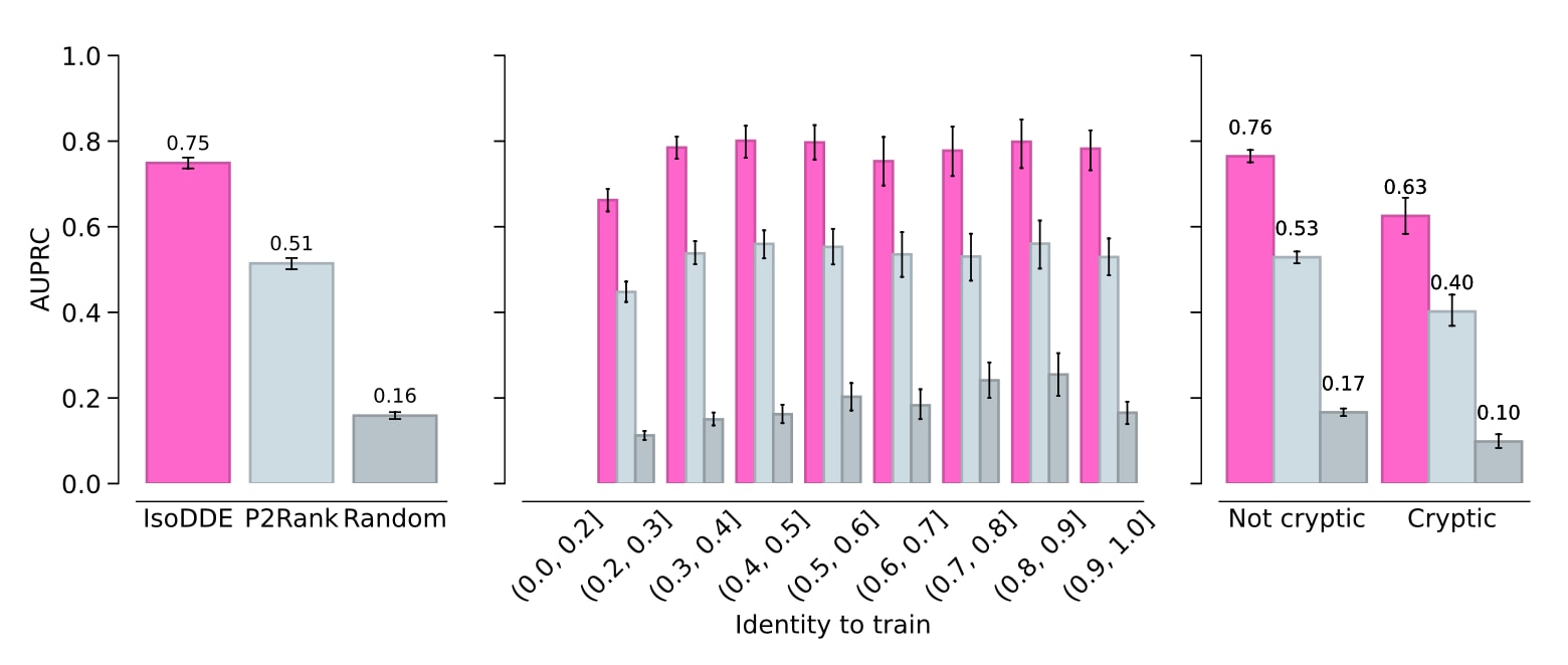 图11|IsoDDE在结合口袋识别任务中整体优于常用的开源模型P2Rank,并且在与训练集序列一致性较低的靶标上仍表现出良好的泛化能力。 结果表明,IsoDDE能够识别被认为并不显而易见的结合口袋,这一点在测试集中隐匿口袋子集上的性能提升中尤为明显。随机基线方法的构建过程在补充材料中给出。图中误差线表示均值的95%置信区间。