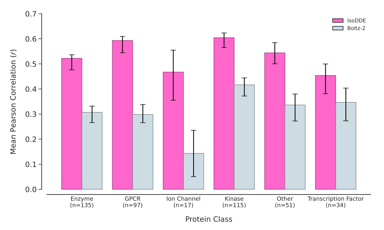 图8|在ChEMBL 35时间切分数据集上,按蛋白类别划分的性能评估结果。 柱状图展示了IsoDDE与Boltz-2在六类蛋白靶标上预测结合亲和力与实验测定值之间的平均Pearson相关系数