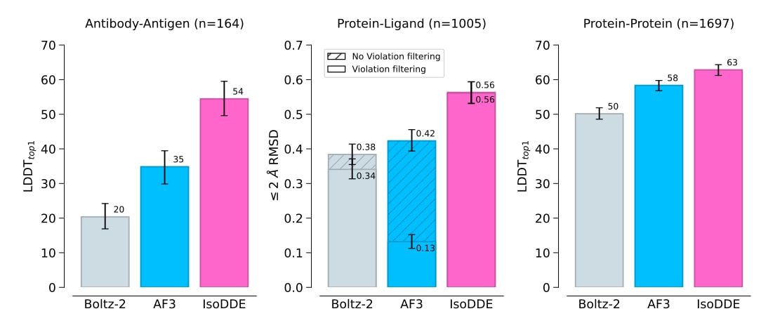 生物分子相互作用的预测是理性药物设计的基础,然而在新颖化学空间中同时实现接近实验精度的预测能力与良好的泛化性能,仍然是当前研究中的关键瓶颈。尽管以AlphaFold 3为代表的深度学习方法显著推动了结构预测的发展,基准测试表明,现有模型在泛化至尚未探索的分子空间、定量估计结合亲和力以及在缺乏先验信息的蛋白表面识别分子结合位点等方面,仍然存在明显局限。为应对这些问题,该研究提出了Isomorphic Labs药物设计引擎IsoDDE,这是一个旨在系统性解决上述挑战的统一计算框架。结果表明,在具有高度挑战性的蛋白-小分子泛化基准上,IsoDDE的预测准确率相较AlphaFold 3提升超过一倍,能够成功建模诱导契合等复杂的分布外事件,并准确识别此前未知的结合口袋。在生物大分子体系中,IsoDDE同样显著优于现有模型,在抗体-抗原界面预测和CDR-H3环结构建模任务上建立了新的性能水平。对于小分子配体,IsoDDE给出的亲和力预测结果甚至超过了公认的物理模拟金标准方法,在避免传统物理流程高昂计算代价的同时,显著缩小了与实验级精度之间的差距。这些结果表明,IsoDDE为人工智能药物设计提供了一个具备良好扩展性的基础平台,能够以此前难以企及的预测精度支持对全新生物体系的探索。