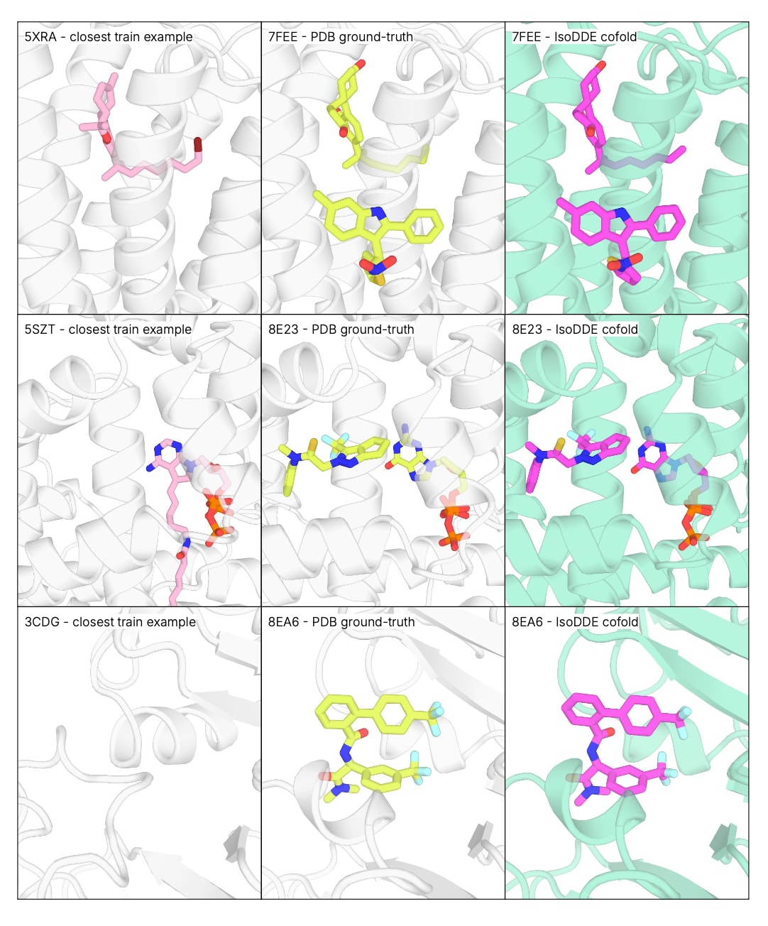 在蛋白-小分子结构预测方面,在Runs N’ Poses蛋白-配体共折叠基准中与训练数据差异最大的子集上,IsoDDE的共折叠预测准确率相比此前的最优方法AlphaFold 3提升超过两倍。同时,该模型能够成功刻画训练集中未曾出现的复杂分布外现象,例如隐匿结合口袋的开启等诱导构象变化。