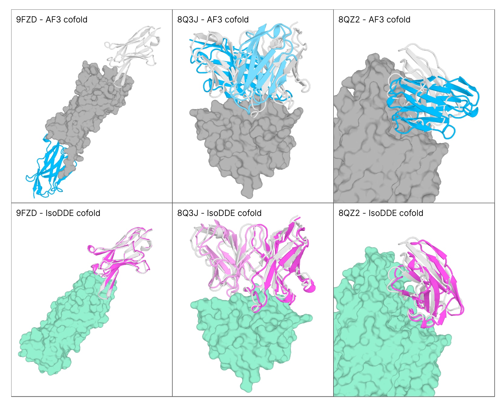 图7|抗体-抗原结构预测的典型案例对比,展示了AlphaFold 3与IsoDDE的预测结果。 左图为纳米抗体与OmpA蛋白的结合结构(PDB:9FZD),中图为Fab片段与小鼠IL-38的结合结构(PDB:8Q3J),右图为纳米抗体与钾离子通道TREK-2的结合结构(PDB:8QZ2)。上排为AlphaFold 3的预测结果,其中抗原以灰色表示,抗体重链为蓝色,轻链为浅蓝色;下排为IsoDDE的预测结果,其中抗原以绿色表示,抗体重链为粉色,轻链为浅粉色。所有预测中均以白色叠加显示实验测定的真实抗体结构。