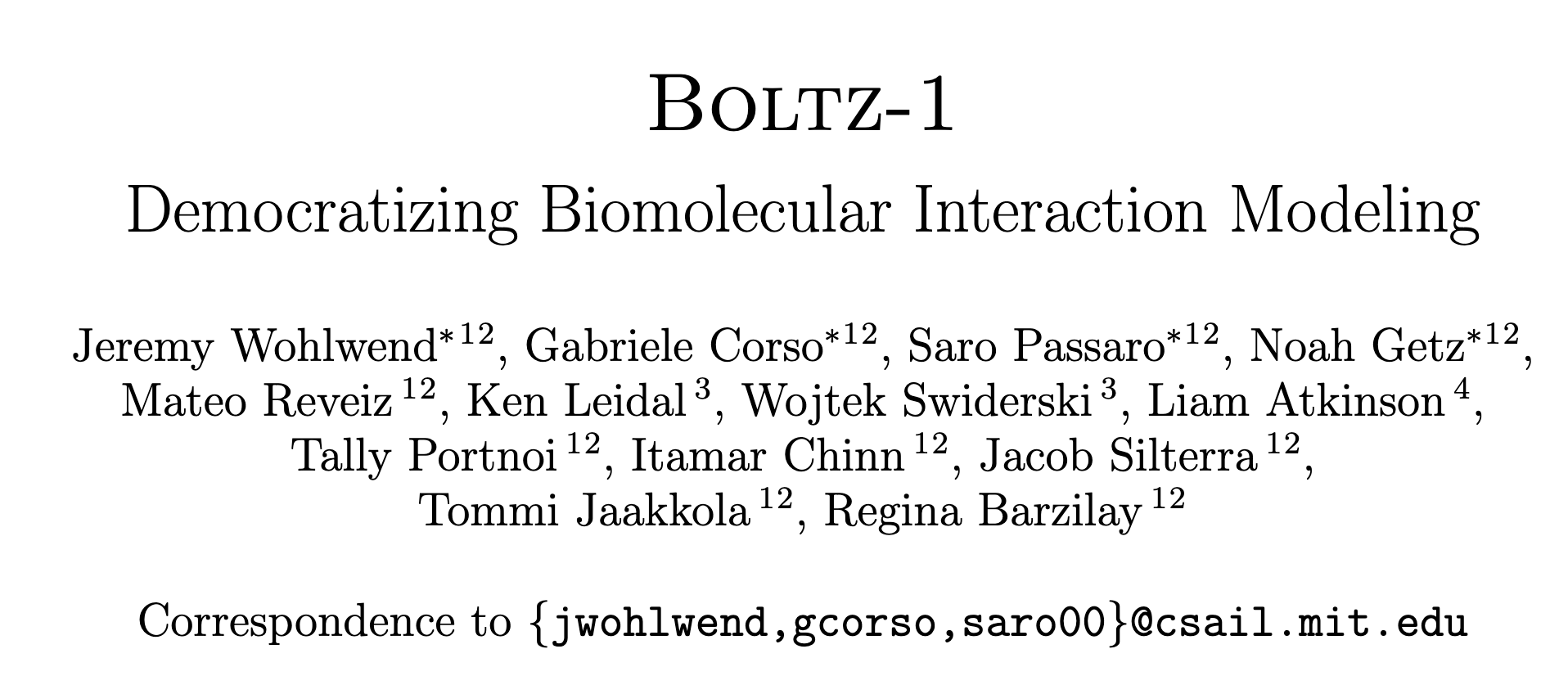 - 论文:Wohlwend, Jeremy, Gabriele Corso, Saro Passaro, et al. “Boltz-1 Democratizing Biomolecular Interaction Modeling.” bioRxiv, March 6, 2025. https://doi.org/10.1101/2024.11.19.624167.
