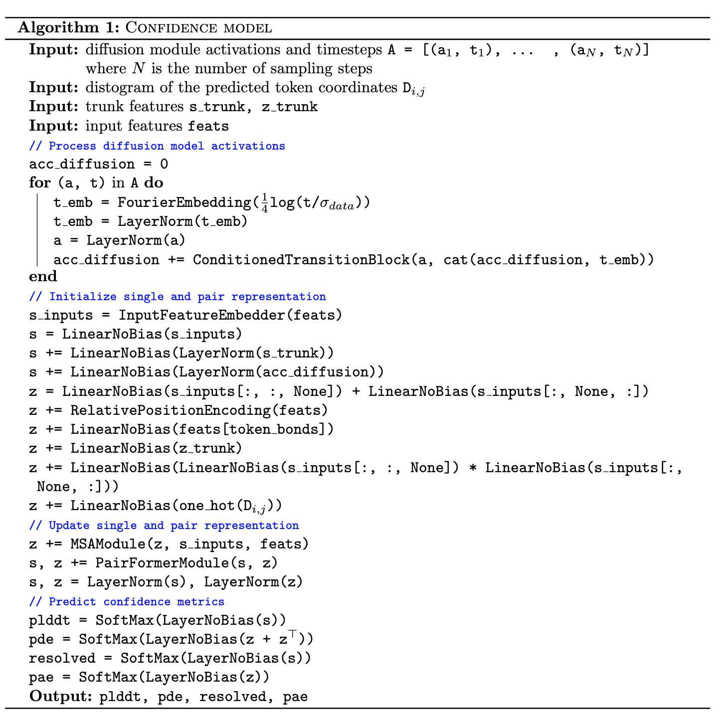 在AlphaFold3中,置信度模型由四层PairFormer组成,输入包括主干网络输出的最终单体(single)和对(pair)token表示,以及反向扩散预测的token两两距离编码。接着通过线性映射,预测晶体结构中每个原子是否解析、原子级LDDT(局部距离差异测试)和token对级别的PAE(预测误差估计)与PDE(预测方向误差)。