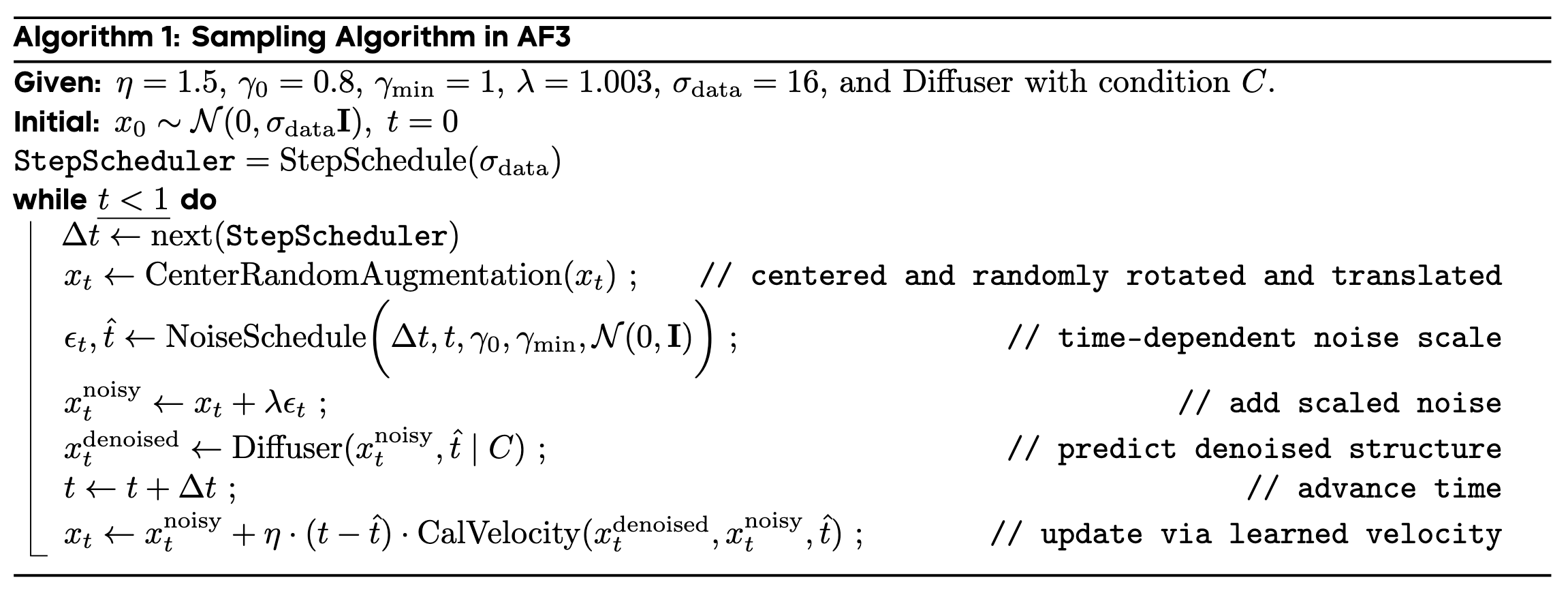在 AF3 中,这一过程由采样算法实现(见算法1),遵循 EDM 框架 [6]:在每一步迭代中,按照预设的时间表向当前样本