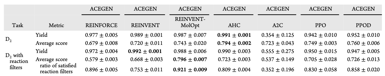 在第一个实验中,研究者比较了不同RL算法在LibINVENT提出的两个任务上的表现。这两个任务均要求对哌嗪(piperazine)骨架进行修饰,并带有D2受体配体常见的胺连接基团。与MolOpt基准类似,预算为10,000个分子。第一个任务旨在优化D2活性预测概率(由QSAR模型评估);第二个任务则加入了选择性反应过滤器,分别奖励哌嗪的Buchwald反应增长和胺连接基的酰胺偶联增长。表6结果显示,两类任务均实现了成功优化:AHC在第一个任务中表现最佳,而REINVENT(无论是默认参数还是MolOpt参数)在第二个任务中表现最佳。但总体而言,除A2C外,所有算法的成功率均超过90%,并且在80%至90%的分子中完全满足选择性反应目标。