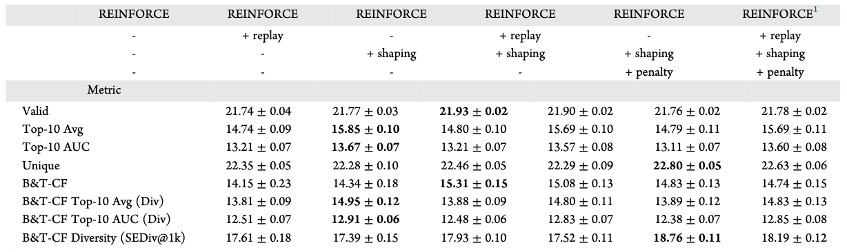 表 4 | REINFORCE 算法在 MolOpt 基准上的消融研究,对比了包含或不包含经验回放、奖励塑形以及高序列似然惩罚等独立组件的表现。