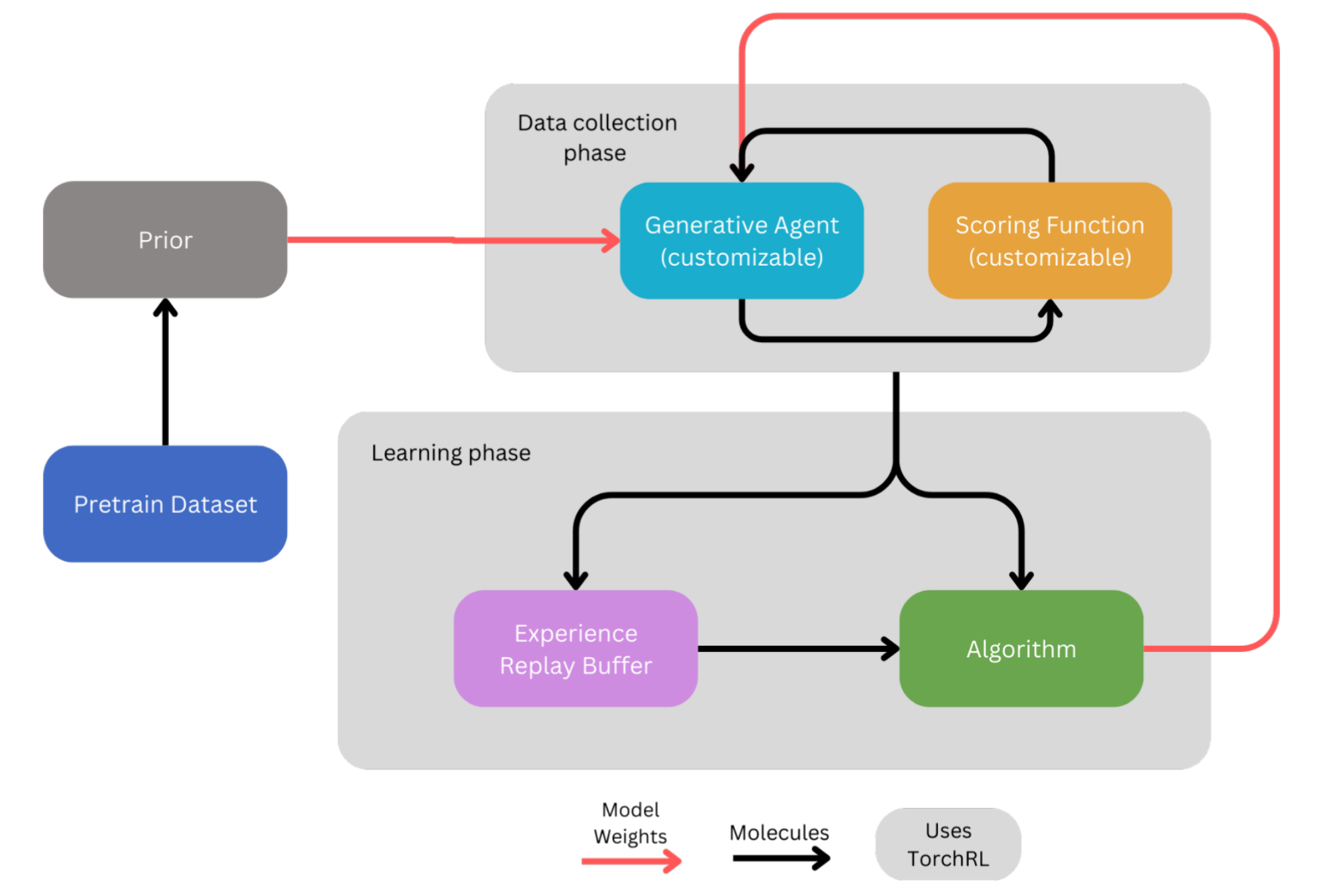 目前已有的药物设计 RL 实现仍严重依赖定制代码,带来冗余、复杂和效率低下,限制了多样化方法的融合。而 RL 社区已有相应的基础设施来缓解这些问题,例如 TorchRL 这一现代 RL 库,提供了经过充分测试的独立模块。本文提出的 ACEGEN,便是基于 TorchRL 组件构建的药物生成工具包,能够组装出高效、可靠的药物发现智能体。这一思路已在无人机控制和组合优化等领域验证成功。此外,该框架便于研究人员在现有组件上扩展新算法,并在 PyTorch 生态中保持高质量、可维护和可拓展性。