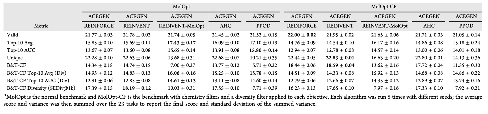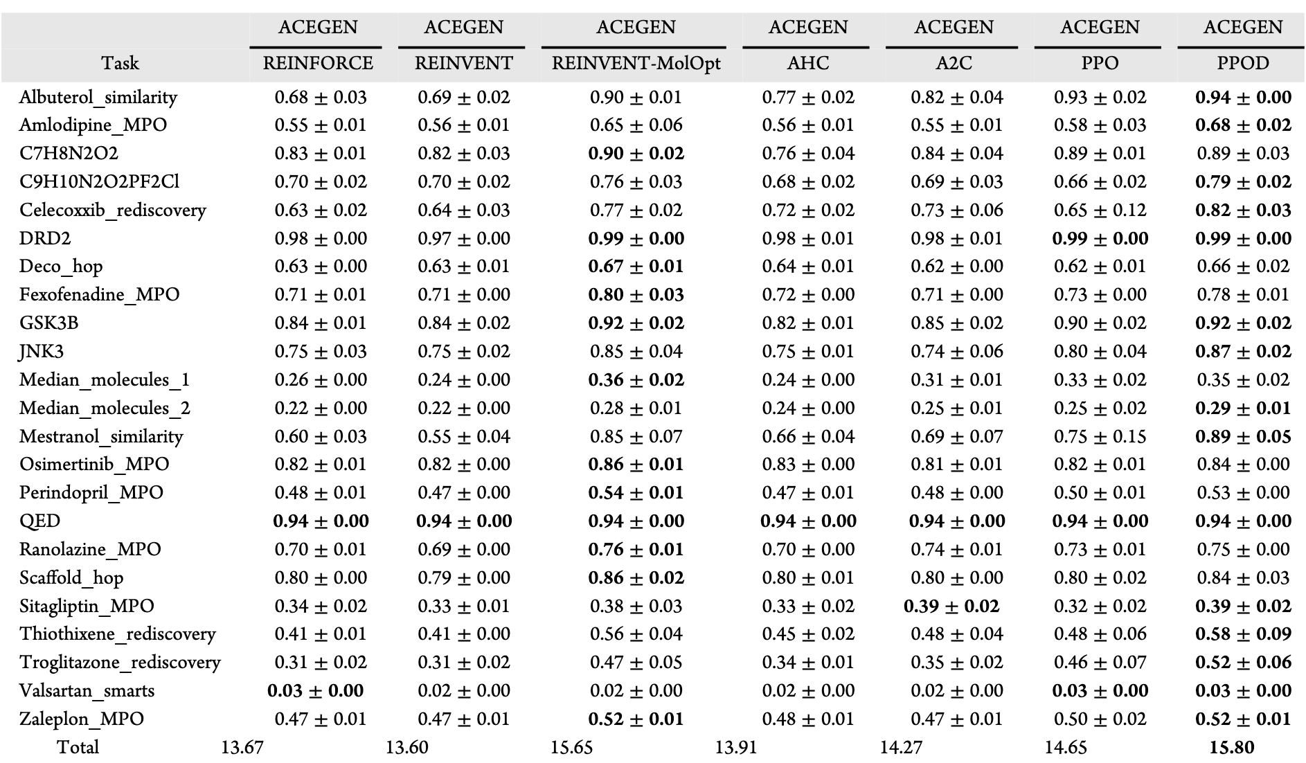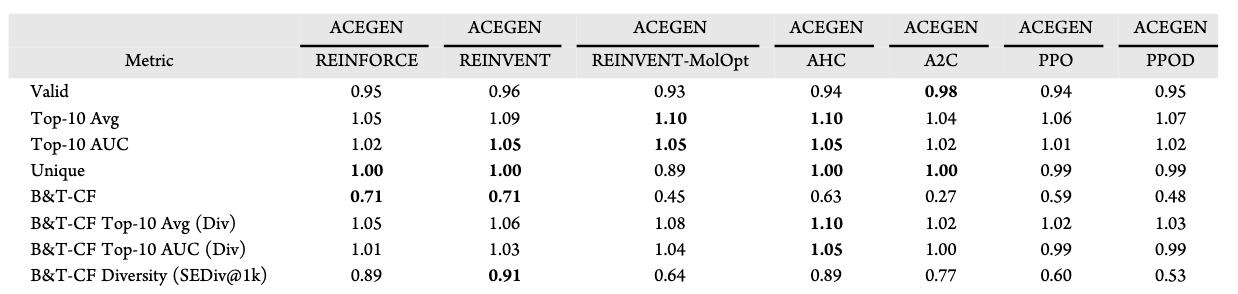 值得注意的是,优化算法、奖励信号与正则化的微调可能具有目标依赖性,这超出了本文的范围,但ACEGEN为这一探索提供了可能性。