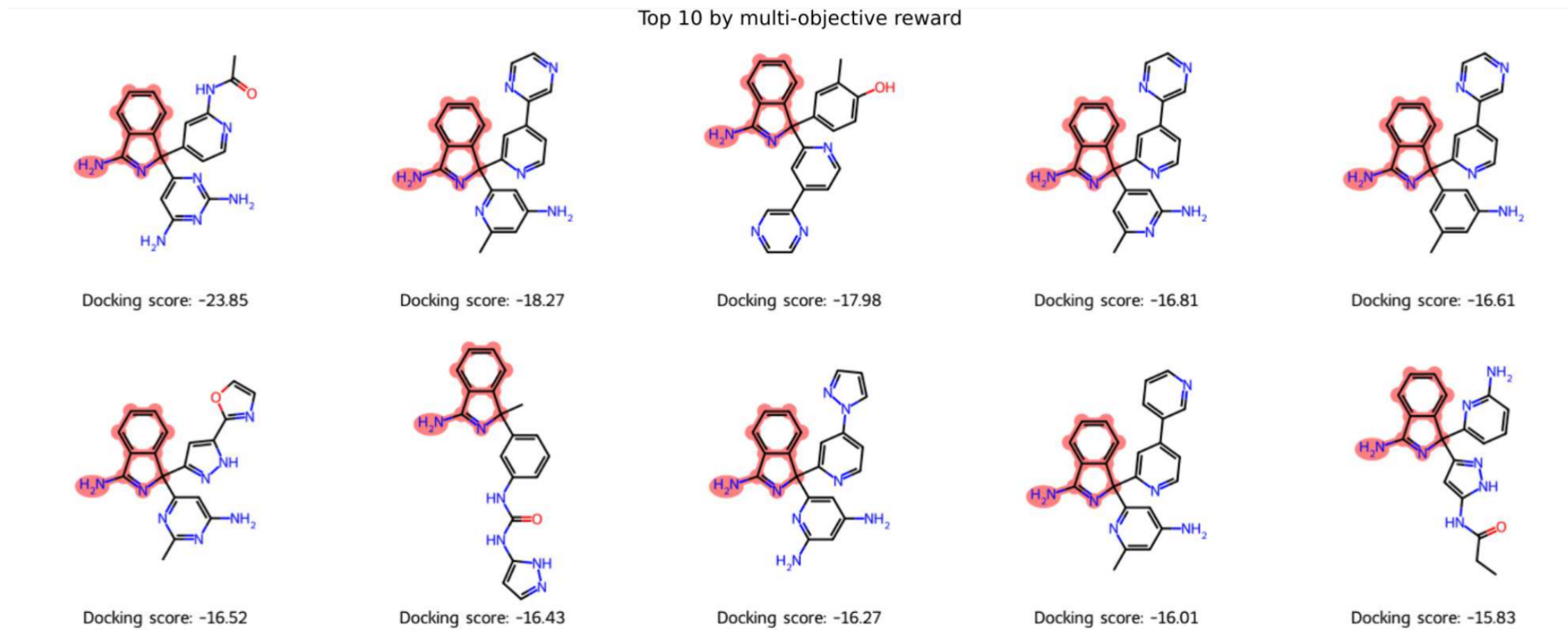 图4 | 多目标奖励的优化 展示了平均奖励及其底层对接打分的优化情况。图中给出了按多目标奖励排序的前10个从头生成分子,红色部分标注了受约束的子结构,对接得分标注在下方。作为参考,共晶配体经重新对接后的得分为−8.44。其对接构象见图S13。