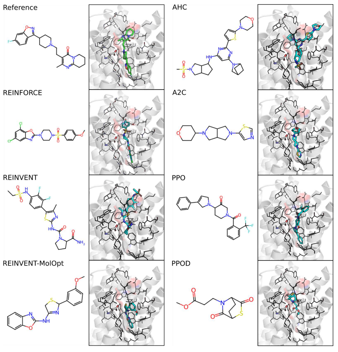 图3展示了一些从头生成的分子及其在5-HT2A受体上的预测对接构象。关于更多方法、分析及从化学角度解读不同RL算法差异的内容,可参见附录Section E。