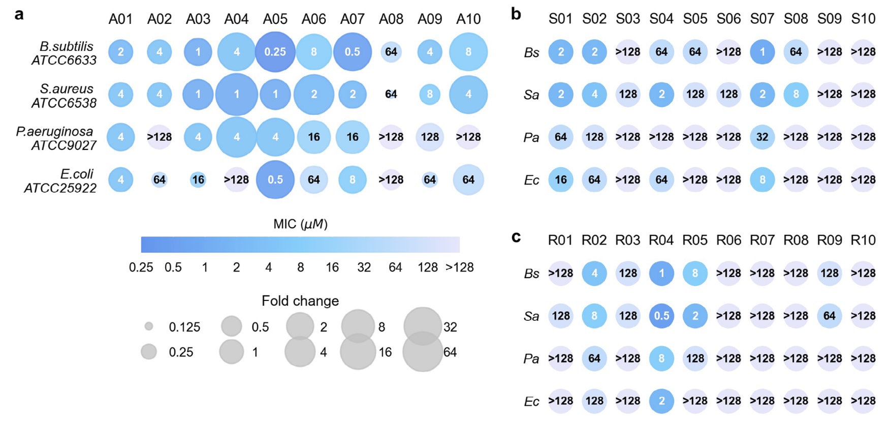 图4 | 进化肽在四种细菌中的最小抑菌浓度(MIC)。 (a) 来自已知AMP进化的前十条序列(A01–A10)。散点面积表示与对应初始序列相比的MIC变化倍数。(b) 来自细菌信号肽进化的前十条序列(S01–S10)。(c) 来自随机序列进化的前十条序列(R01–R10)。细菌菌株包括:Bs,B.subtilis ATCC6633;Sa,S.aureus ATCC6538;Pa,P.aeruginosa ATCC9027;Ec,E.coli ATCC25922。