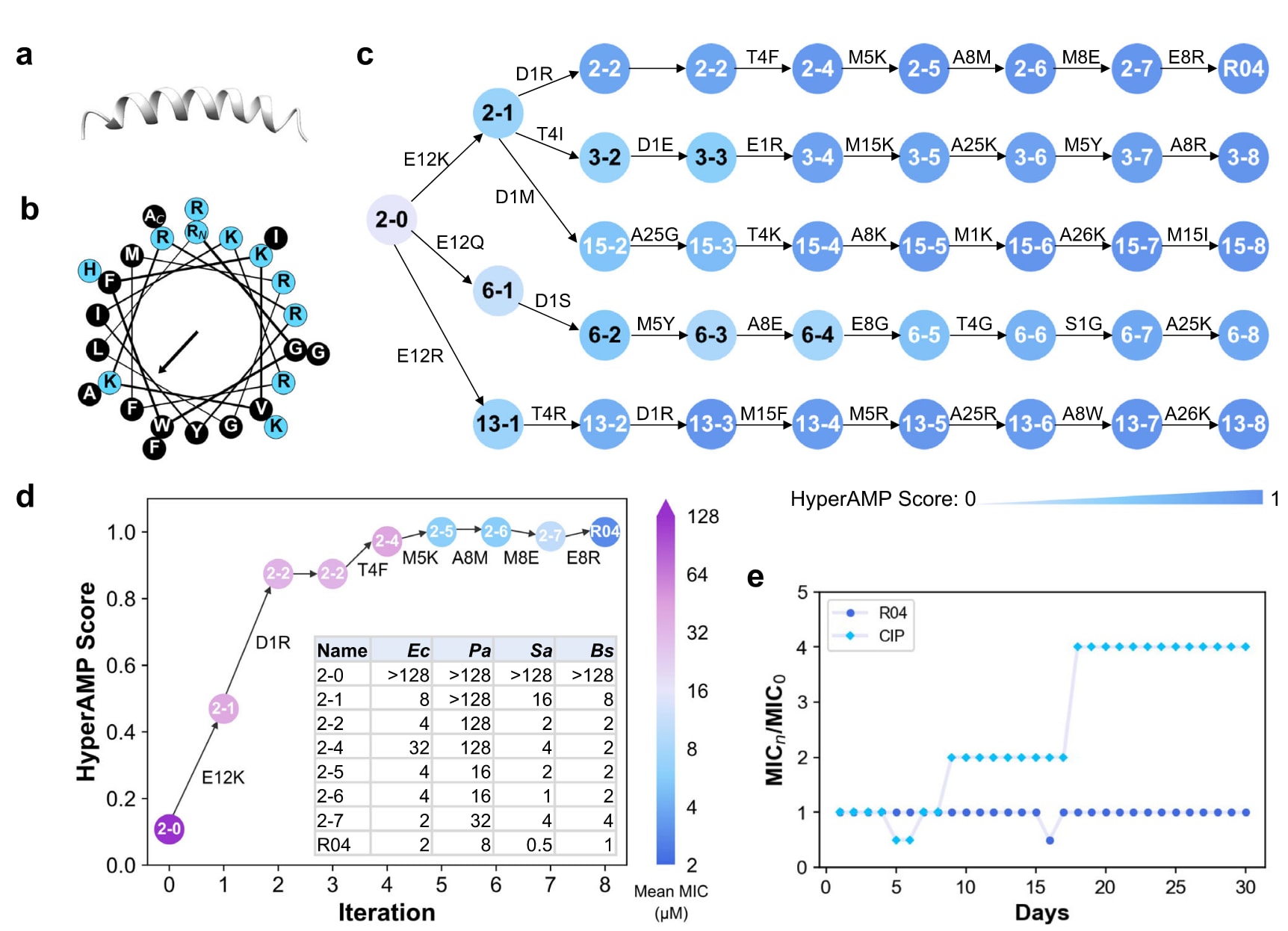 图6 | AMPainter生成的从头设计AMP R04的表征。 (a) R04的结构,由AlphaFold2预测。(b) R04的螺旋轮表示图,蓝色表示极性残基,黑色表示非极性残基。(c) R04的五条并行虚拟进化路径,肽名标注为“路径-迭代”,其中HyperAMP得分低于0.6的以黑色显示以便区分。(d) R04路径上序列的预测HyperAMP得分与实测平均MIC值一致。细菌包括:Ec,E.coli ATCC25922;Pa,P.aeruginosa ATCC9027;Sa,S.aureus ATCC6538;Bs,B.subtilis ATCC6633。(e) R04的30天耐药性测试。CIP为环丙沙星。