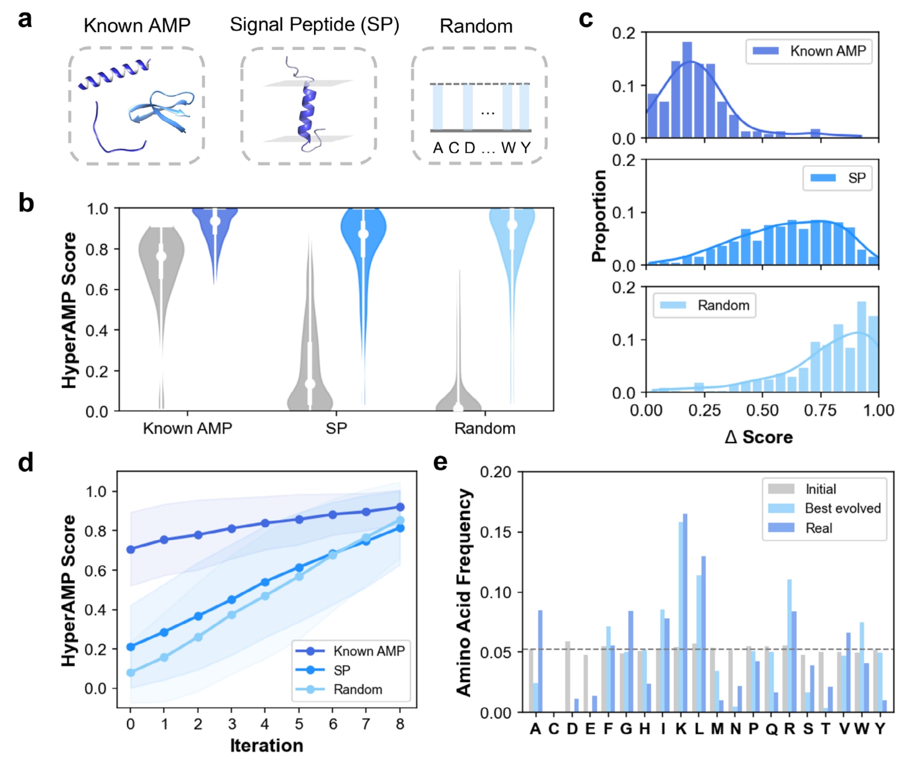 图3 | AMPainter的应用。 (a) 三类输入序列:已知AMPs、细菌信号肽(SPs)及随机序列。(b) 三类序列在AMPainter进化前后的整体得分分布,灰色为初始序列,蓝色为最佳进化序列。(c) 三类输入序列的活性提升量(Δ score)分布。(d) 三类序列在八轮进化迭代中的平均得分变化趋势。(e) 初始随机序列、AMPainter进化后的最佳序列及真实AMP的氨基酸频率分布。