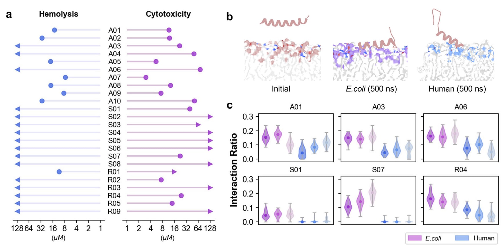 图5 | 进化肽的溶血性、细胞毒性及膜作用偏好。 (a) 由AMPainter进化得到的AMP在大鼠红细胞上的溶血活性(HC25)及在人胚肾细胞HEK293T上的细胞毒性(CC50)。(b) 分子动力学模拟的代表性快照,展示了R04肽与大肠杆菌内膜或人类质膜模型的相互作用。(c) AMP重原子与膜重原子之间的相互作用比例(距离阈值为3.5 Å)。