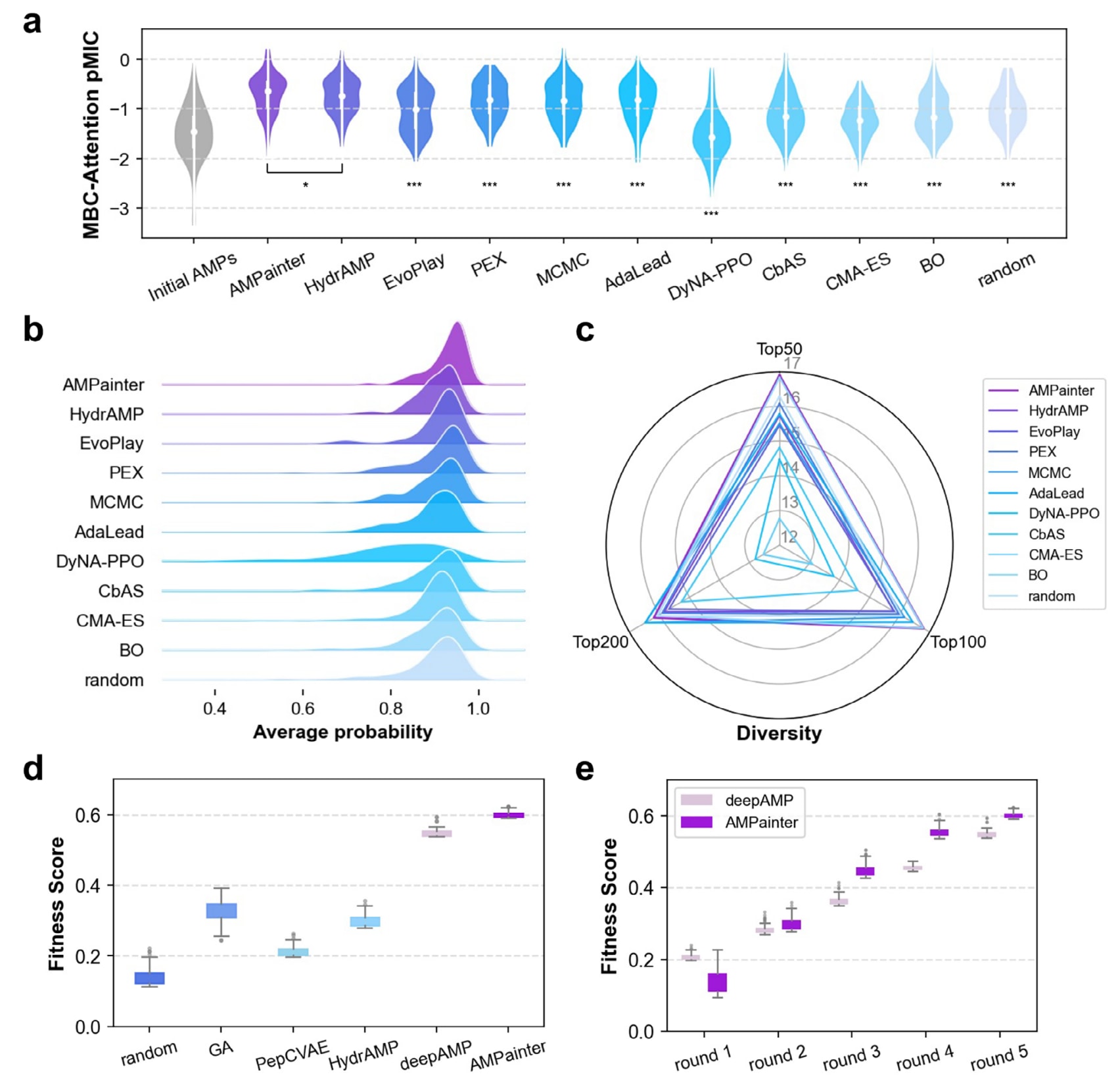 图3 | AMPainter在不同初始序列上的进化表现。 (a) 三类输入序列:已知AMPs、SPs与随机序列。(b) 初始序列与进化后最佳序列的抗菌评分分布。(c) 每条肽的提升量(Δ score)。(d) 三类序列在八轮进化中的平均得分变化。(e) 随机序列在进化前后的氨基酸频率分布,与真实AMP对比。结果显示,AMPainter能够普遍提升不同来源序列的抗菌效力,并逐渐进化出符合真实AMP特征的氨基酸组成。