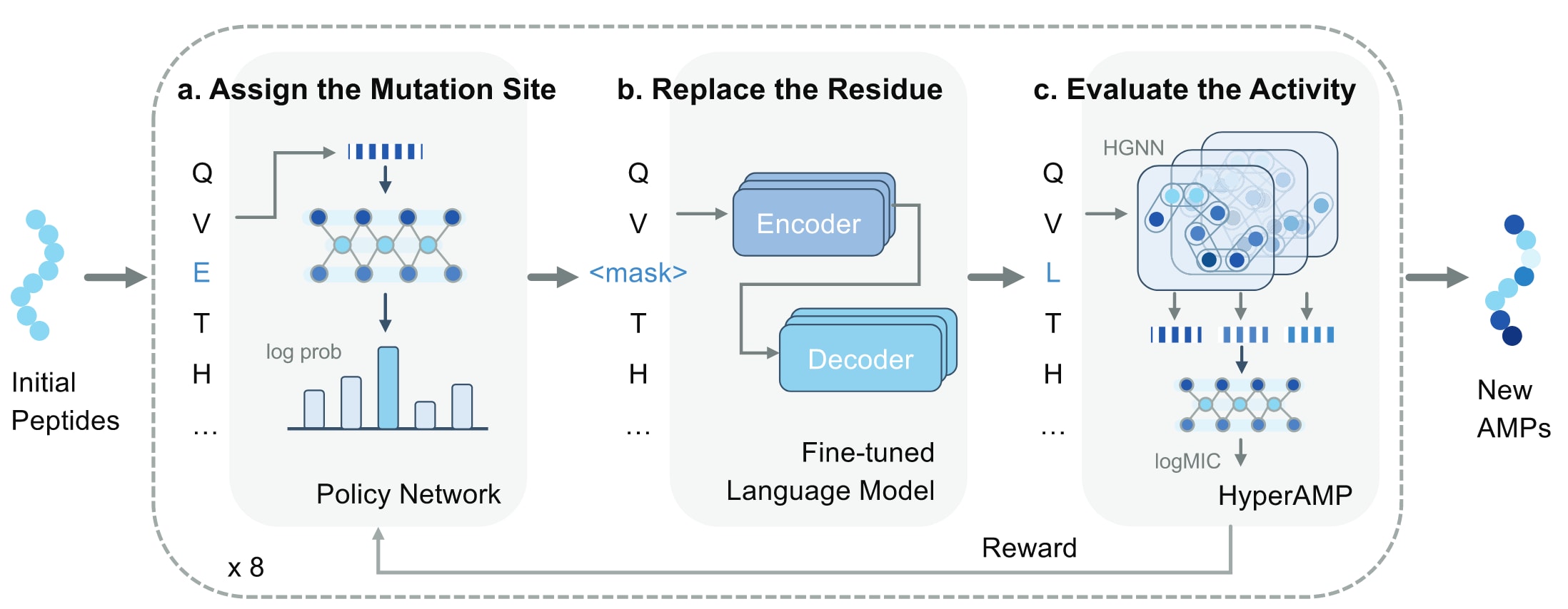 图1 | AMPainter的整体框架 在输入一组肽序列后,AMPainter能够通过一个迭代的三步流程将其进化为新的抗菌肽。首先,利用策略网络选择突变位点(a);随后,通过微调后的语言模型替换相应的氨基酸残基(b);最后,借助名为HyperAMP的预测器评估抗菌活性(c)。其中,HyperAMP是一种基于超图神经网络的模型,已在整合进入AMPainter之前使用已知AMP及其活性标签进行训练。预测得到的抗菌评分将作为奖励信号,反馈至强化学习过程以更新策略网络。整个流程中,每条肽序列都会经历八轮迭代,逐步演化出具有更高抗菌效力的新序列。