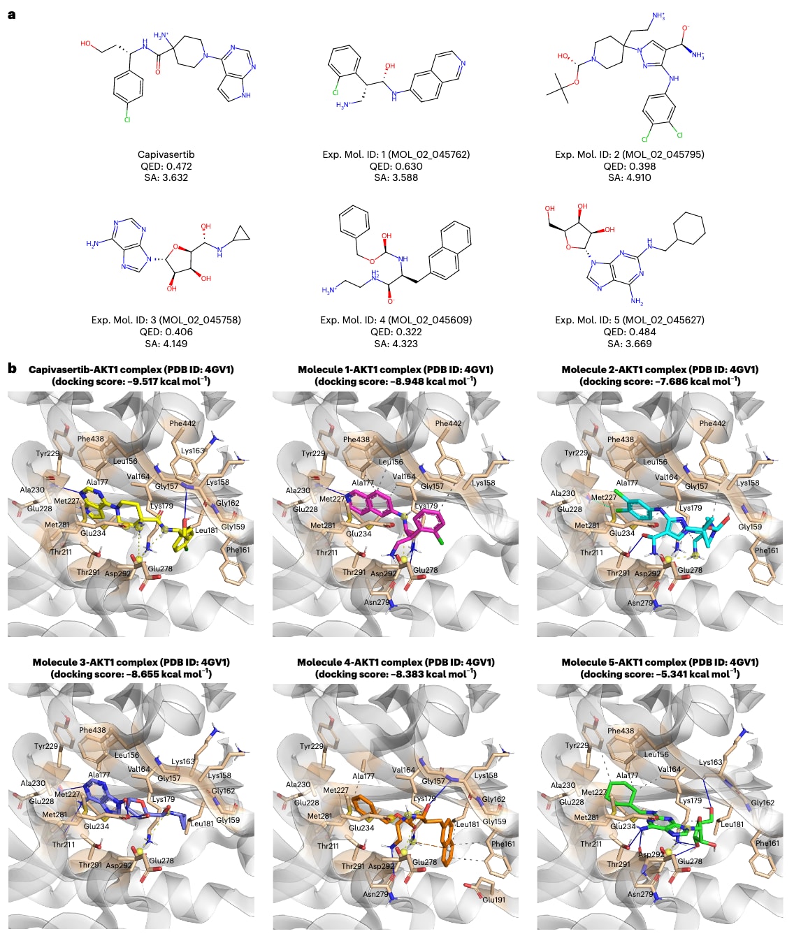 图4 | Capivasertib(结合配体,PDB: 4GV1)与五个从头生成分子的结构分析。 a,Capivasertib与分子1–5的二维可视化图,包括在分子生成过程中分配的唯一标识符、QED值与SA值。b,Capivasertib与分子1–5在与AKT1(PDB ID: 4GV1)对接后的三维蛋白-配体相互作用图。AKT1活性位点残基以米色高亮显示。不同的相互作用类型标注如下:蓝色线为氢键(H键),黄色虚线为盐桥,灰色虚线为疏水作用,橙色虚线为π–阳离子作用,绿色线为卤键。Exp. Mol. ID,实验分子编号。