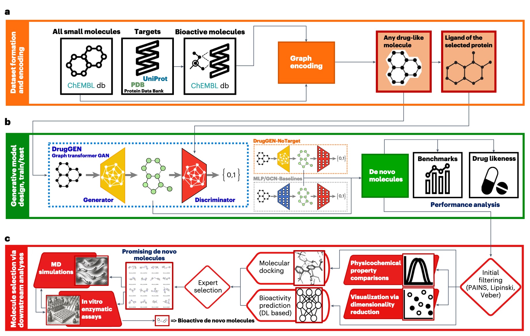 图1 | 研究流程。 a,小分子及其生物活性的数据集准备,并将样本进行基于图的编码。b,DrugGEN的图变换器-GAN架构,模型训练与评估包括对从头生成分子进行基础基准测试和类药性相关指标的检测。c,通过一系列计算机模拟实验对生成分子进行筛选,找出能够有效靶向所选蛋白的潜在候选物。