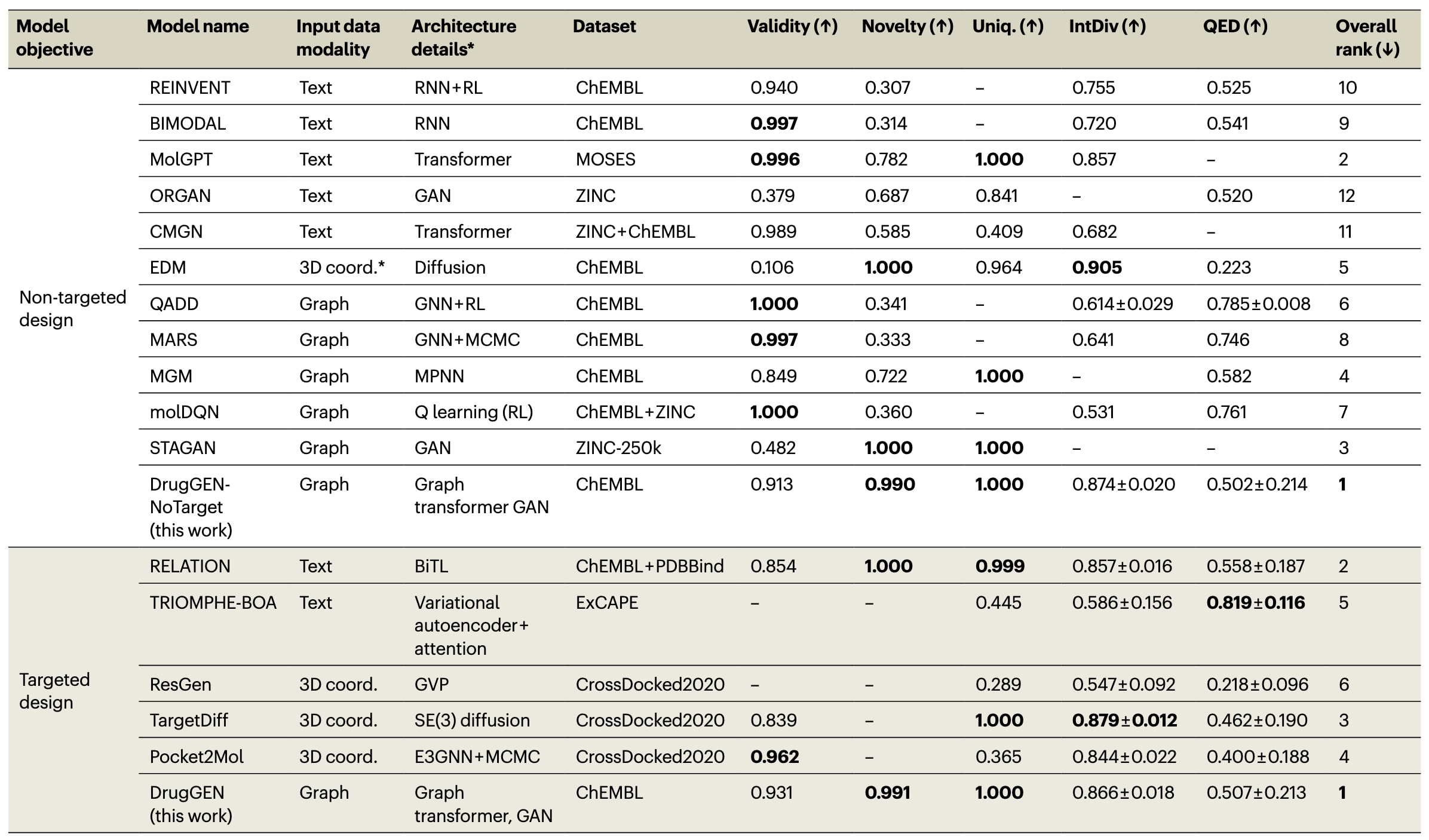 表1 | DrugGEN与其他方法的整体分子生成性能。