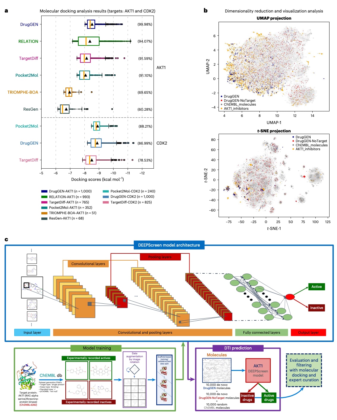 图3 | 从头生成分子的下游分析。 a,箱线图展示了多种模型在AKT1与CDK2上的对接结果:包括DrugGEN、RELATION、TargetDiff、Pocket2Mol、TRIOMPHE-BOA和ResGen在AKT1上的表现,以及DrugGEN、TargetDiff和Pocket2Mol在CDK2上的表现。图例标注了各模型使用的分子数量(n),若模型无法生成足够多的有效且唯一分子,则n值偏低。箱体表示四分位距(Q1–Q3),橙色线为中位数,黑色三角形为均值,须状线延伸至±1.5倍四分位距,超出范围的点以实心圆表示。箱线旁的百分比为对接得分相对真实抑制剂的归一化结果(真实抑制剂最高分设为100%)。模型根据中位结合自由能排序,数值越低表示预测亲和力越强。b,UMAP与t-SNE二维投影展示了不同来源分子的分布,包括DrugGEN与DrugGEN-NoTarget生成的分子、真实AKT1抑制剂以及随机选择的ChEMBL分子。t-SNE-1与t-SNE-2分别表示第一、第二维度。c,基于深度学习的生物活性预测分析。上方为DEEPScreen流程:输入分子的二维像素化结构图,经卷积神经网络处理。左下为AKT1模型的训练数据,来源于ChEMBL结合实验的二值化活性数据。右下展示了推理阶段,DrugGEN与DrugGEN-NoTarget生成的分子及随机ChEMBL分子被输入DEEPScreen AKT1模型进行预测。