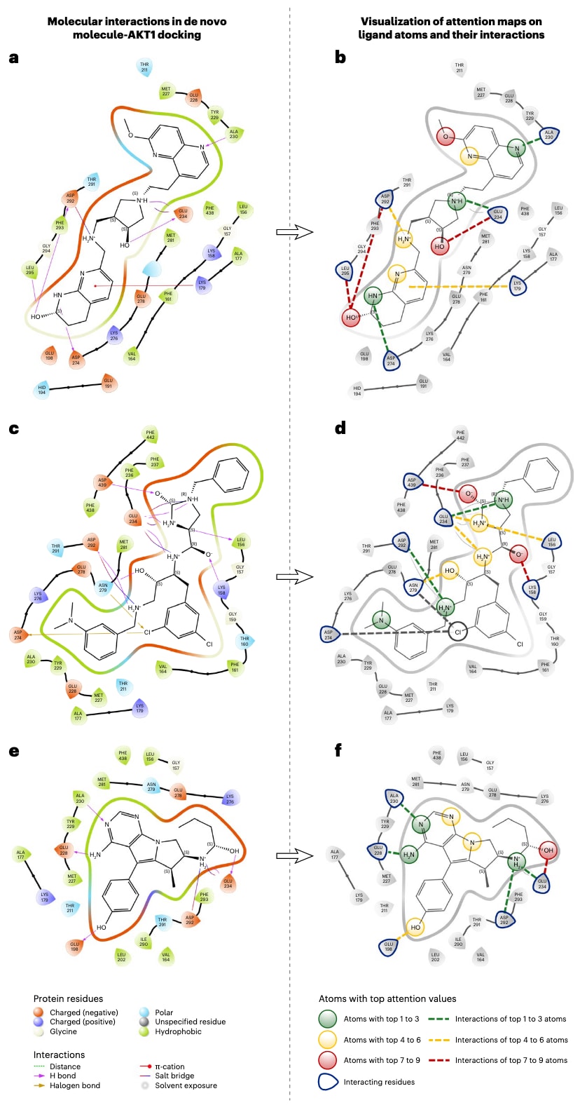 图5 | 三个从头生成分子的DrugGEN注意力图可视化。 a,c,e,三个DrugGEN生成分子与AKT1蛋白结构(PDB ID: 4GV1)的分子对接所得到的蛋白–配体相互作用图。对接配体位于结合口袋中,残基与配体的相互作用以线条表示,并按相互作用类型上色。蛋白残基根据理化性质着色。b,d,f,同三个分子的注意力图,来自DrugGEN生成器网络的图变换器模块。获得最高注意力分数的原子以颜色标出(绿色:第1至3个原子;黄色:第4至6个原子;红色:第7至9个原子,具有最高注意力分数),注意力较低的原子不着色。在b、d和f中,受体–配体相互作用(即对接分析得到的结果)以虚线表示,颜色与相应参与作用的分子原子注意力分数一致;若某作用原子未被捕获(注意力分数较低),则相互作用以灰色标注。a与b:分子编号MOL_02_045597,对接得分−9.803 kcal·mol⁻¹。c与d:分子编号MOL_02_000496,对接得分−9.693 kcal·mol⁻¹。e与f:分子编号MOL_02_008350,对接得分−9.619 kcal·mol⁻¹。