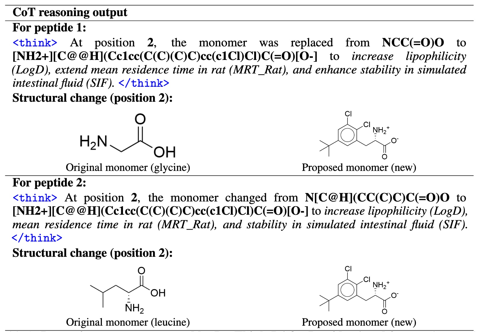 表 3:PepThink-R1 在肽 1 和肽 2 上的推理过程。 每个案例中,推理文本均配有两个单体的可视化,一个为原始单体,一个为新提出的单体。