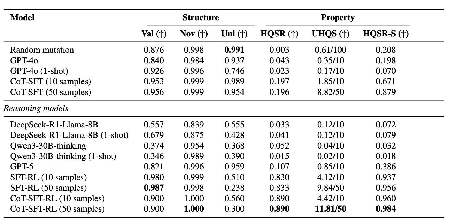 在**化学生成中的链式思维(CoT)监督微调(SFT)**方面,CoT 通过在得到最终答案前生成中间推理步骤来增强 LLM 的推理能力,现已成为提升现代 LLM 推理性能的重要技术。近年来,一些工作将 CoT 推理拓展到生物化学相关问题中,包括化学问答、蛋白–蛋白相互作用预测、分子结构理解与性质预测。然而,将 CoT 直接引入 LLM 的监督微调用于化学优化,目前尚属首次探索。