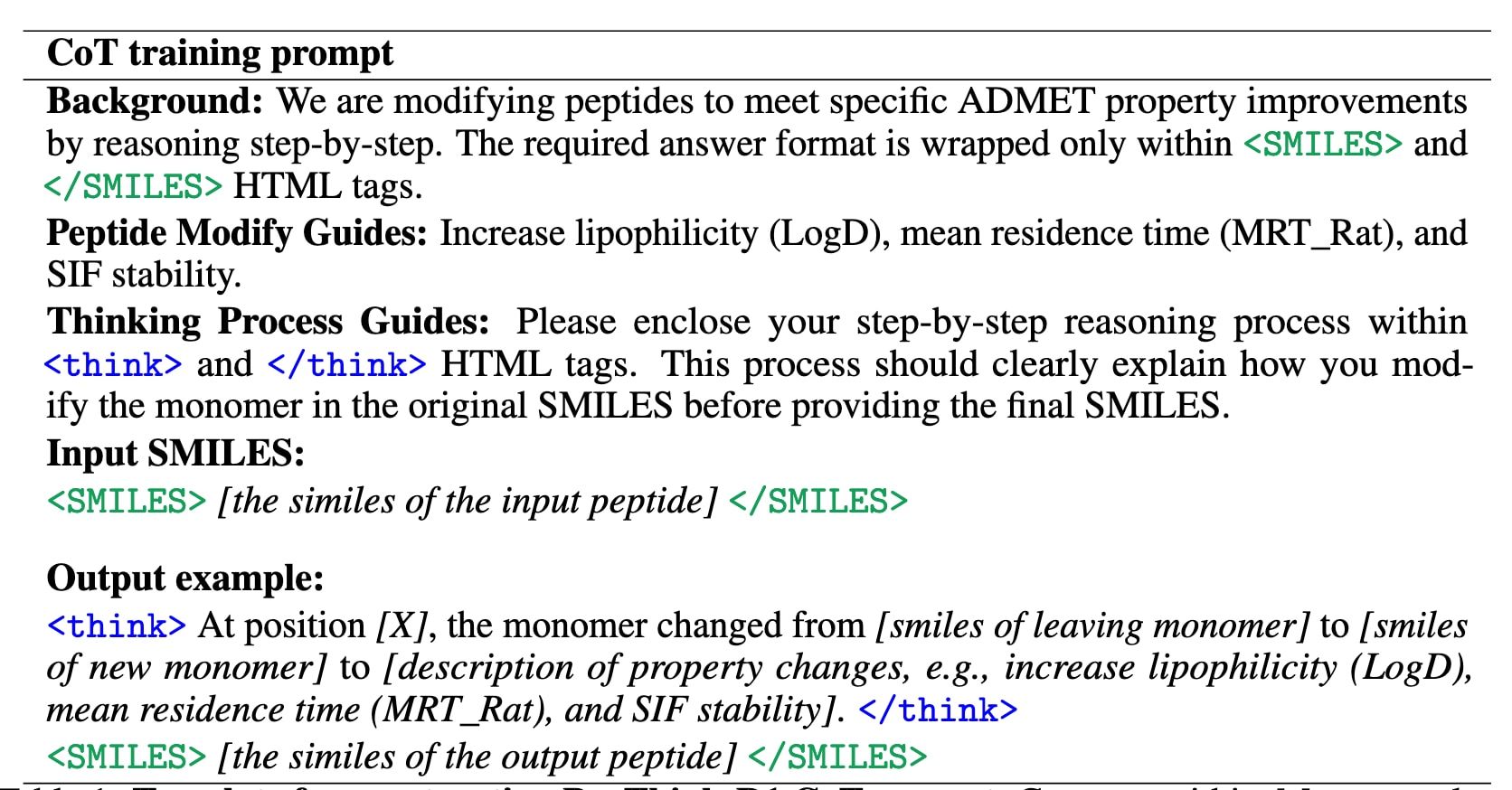 表 1:PepThink-R1 的 CoT 提示模板。 方括号[ ]内的内容由具体的肽对实例填充。