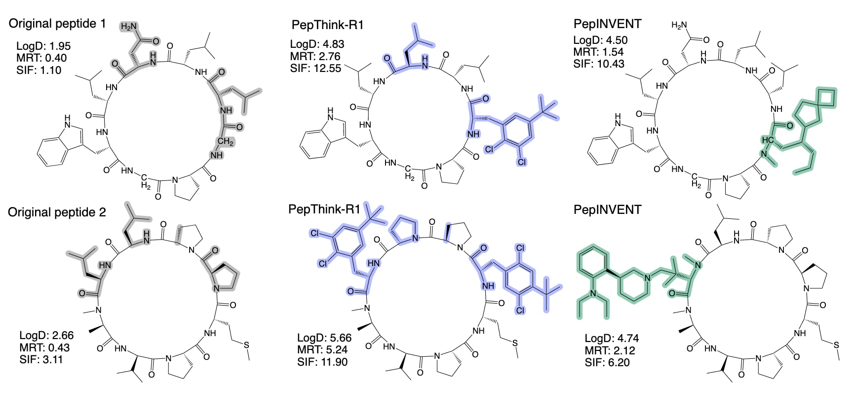 图 3:种子肽以及 PepThink-R1 和 PepINVENT 生成肽的化学结构与性质值。 展示两个典型案例,每个案例包含三种结构:原始肽、PepThink-R1 生成肽、PepINVENT 生成肽。结构差异分别以灰色、蓝色和绿色标注,展示了 PepThink-R1 在设计上的不同之处。
