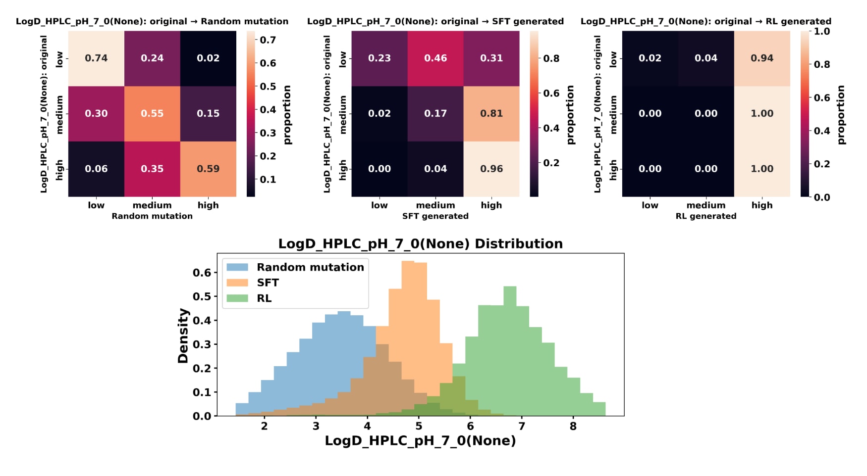 随机突变几乎无法稳定改善性质。 例如,在LogD指标中,仅有2%的低LogD肽被提升至高水平,而41%的高LogD肽降至中低区间。类似模式也出现在MRT与SIF中:高质量肽常常退化,而低至中等水平的肽则大多停留在原有区间。这表明单纯随机编辑在改善ADMET性质上极为低效。