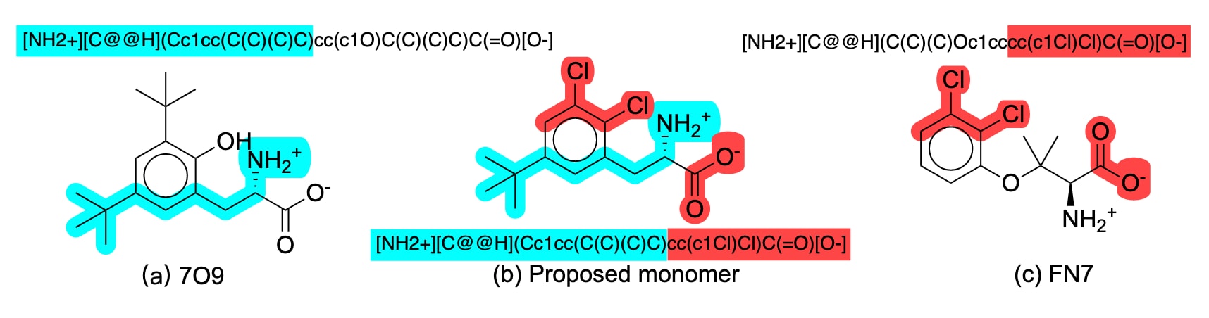 图 4:所提出单体的结构及其在单体数据库中的潜在来源。 所提出单体(b)由两个部分组成,这两部分均存在于单体数据库中(在结构和 SMILES 字符串中分别以青色和红色标注)。其中,青色部分来源于单体(a) 7O9,红色部分来源于单体(c) FN7。