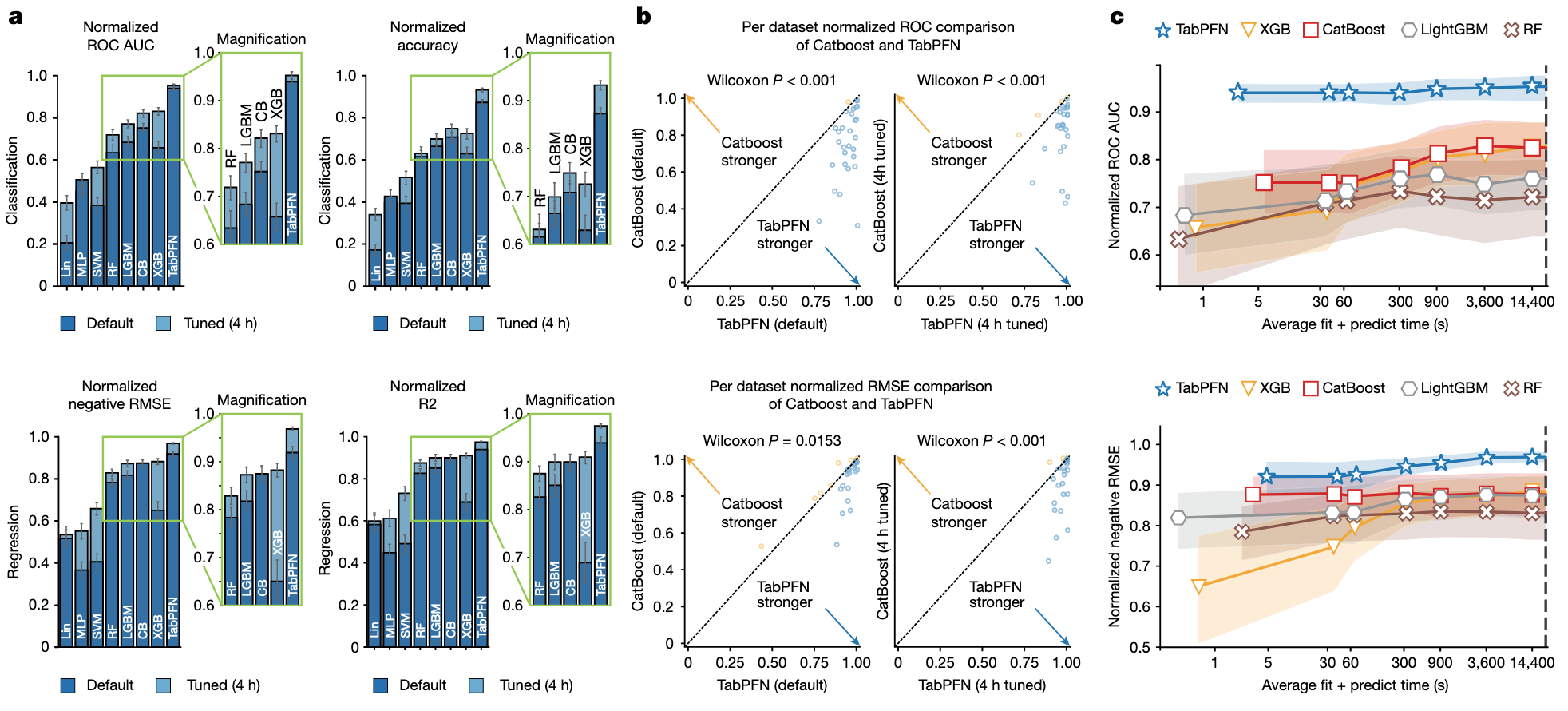 图 4 | TabPFN 在测试基准上的比较 (数据集最多含 1 万个样本、500 个特征)。 在聚合前对每个数据集进行归一化;区间表示 95%置信区间。Wilcoxon P 为双侧 Wilcoxon 符号秩检验的 P 值。a, TabPFN 默认与调优版本的平均性能对比,以及各基线方法(调优目标为 ROC AUC 或 RMSE,因此次要指标代表性下降)。右侧为强基线的放大分析。b, TabPFN 与其最强基线 CatBoost 的逐数据集对比,每个点为一个数据集的平均得分。c, 各方法超参数调优的影响,横轴为拟合与预测的平均时间。