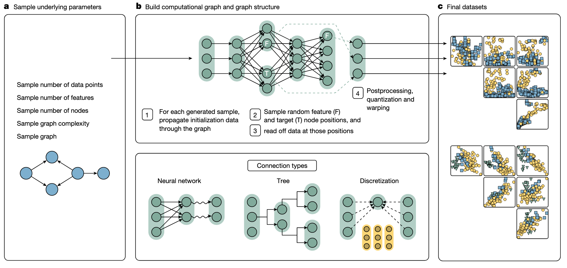 图 2 | TabPFN 先验的概览。 a, 对于每个数据集,首先采样高层次的超参数。b, 基于这些超参数,构建结构因果模型,用以编码生成数据集的计算函数。每个节点包含一个向量,每条边根据连接类型在计算图中实现一个函数。步骤 1:使用随机噪声变量生成初始化数据,输入至根节点并在计算图中传播,得到待生成样本。步骤 2:随机采样图中的特征节点与目标节点位置,分别标记为 F 和 T。步骤 3:提取所采样位置的中间数据表征。步骤 4:对提取数据进行后处理。c, 获得最终数据集,并绘制特征对的交互,节点颜色表示样本类别。