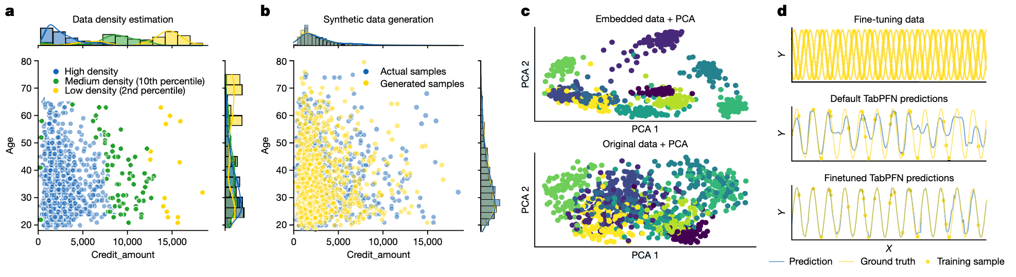 图 6 | TabPFN 作为表格基础模型的应用展示。 a,b, 在 German Credit 数据集上进行数据密度估计(a)与新合成样本生成(b)。c, 在手写数字数据集(mfeat-factors)上展示 TabPFN 学习到的嵌入作为有效表征,不同类别形成不同聚类。d, 展示了对特定任务的微调效果。在包含多种正弦曲线的数据集上微调后,模型在另一个正弦曲线数据集上的预测更为准确。