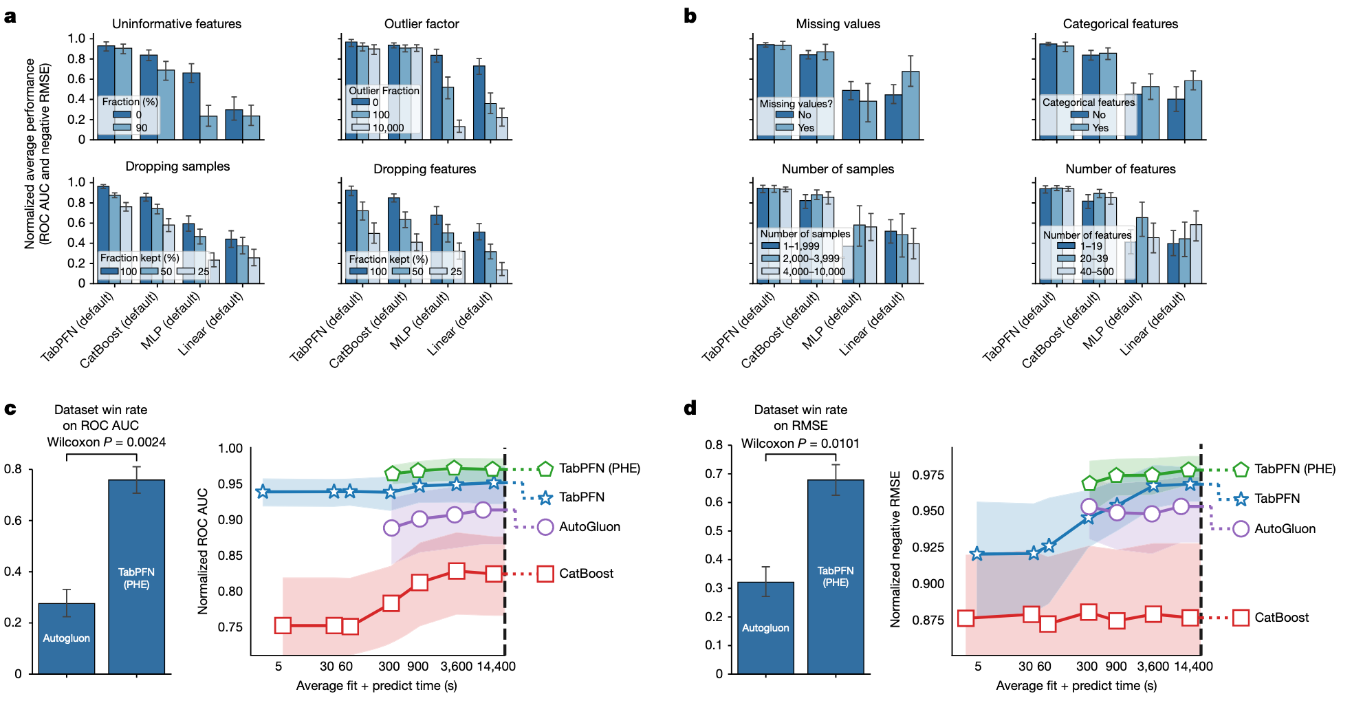 图 5 | 数据集间的鲁棒性与与调优后集成方法的性能比较。 a, 修改数据集的比较。TabPFN 对修改的敏感度不高于基线,并且在仅使用一半训练样本时即可复现 CatBoost(默认)的精度。此处每个实验的所有修改版本共享一次归一化,以避免负异常值。b, 按数据特征划分测试集,分析各子组性能。c, 分类性能。左:TabPFN (PHE) 相对 AutoGluon 的胜率(排除一次平局);右:各方法调优过程中 ROC AUC 随时间变化,非集成方法的第一个点为默认配置。d, 回归性能,与 c 相同,但评价指标为 RMSE。区间表示 95%置信区间,Wilcoxon P 为双侧检验结果。