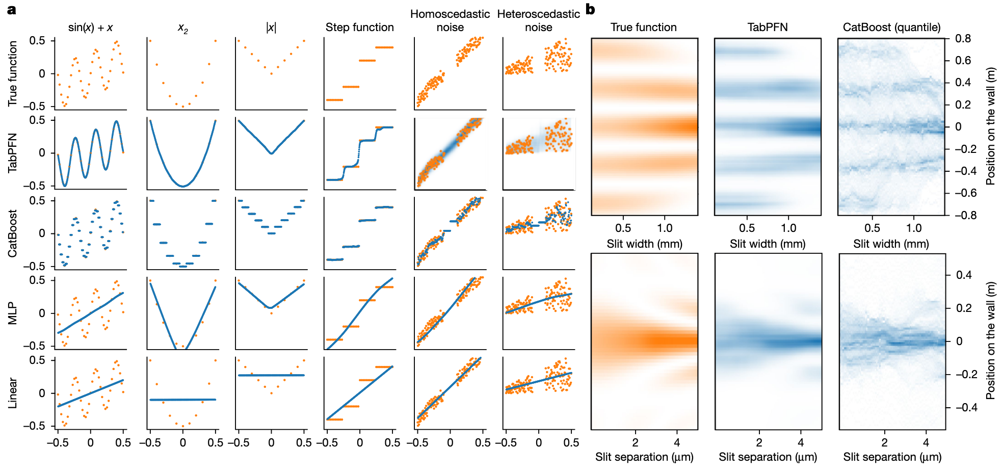 图 3 | TabPFN 与基线方法在简单函数上的表现。 图中橙色为真实值,蓝色为模型预测。a, 每列为一个玩具函数,均只有一个特征(横轴)和一个目标(纵轴)。TabPFN 能够建模多种不同函数,包括含噪声函数。b, TabPFN 天然具备对输出分布建模的能力,例如在观察 1000 个光子位置后,预测双缝实验的光强分布模式。